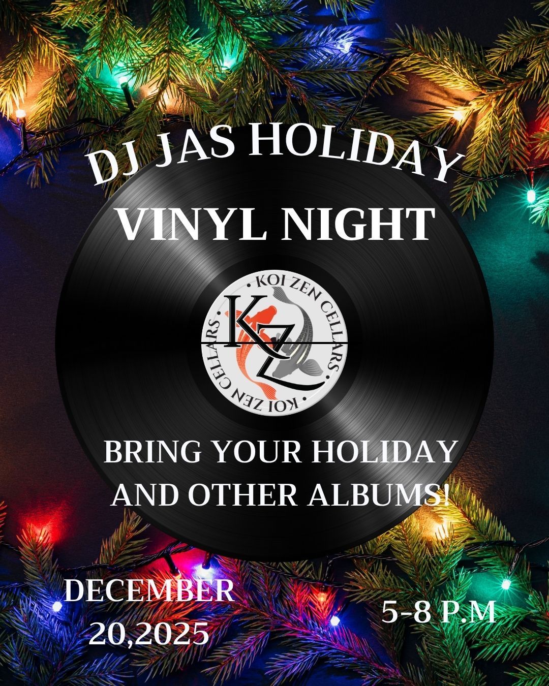 Dust off your favorite records and drop the needle on holiday nostalgia! DJ Jas is spinning your soundtrack—straight from the albums you bring, from classic rock to festive favorites. Let’s rewind time and celebrate the season with great music, joyful vibes, and award-winning Koi Zen wine. If your not in the holiday spirit, this will surely put you there. Endless memories.