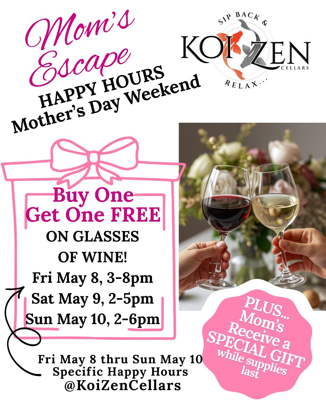 Moms Join us for BOGO glasses of wine these dates and times on Mother’s Day Weekend