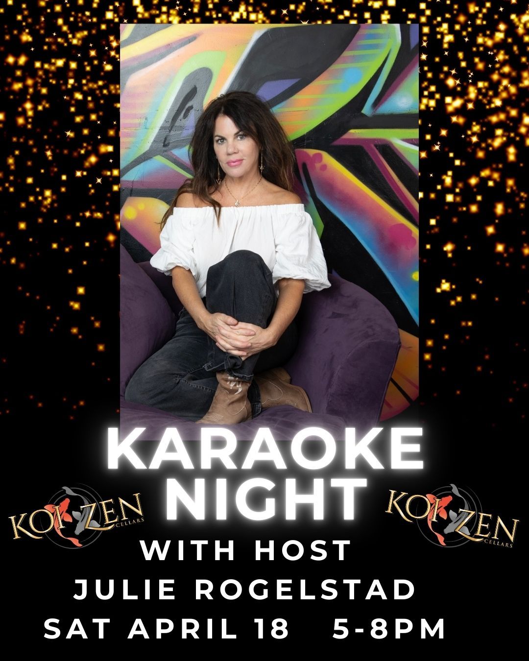 Get ready to grab the mic and light up the room! Join us for an unforgettable Karaoke Night at Koi Zen Cellars, hosted by the incredibly talented Julie Rogelstad of Riptide and Run for Cover. With her passion for music and infectious energy, Julie sets the stage for a night full of laughter, bold performances, and unforgettable moments.
