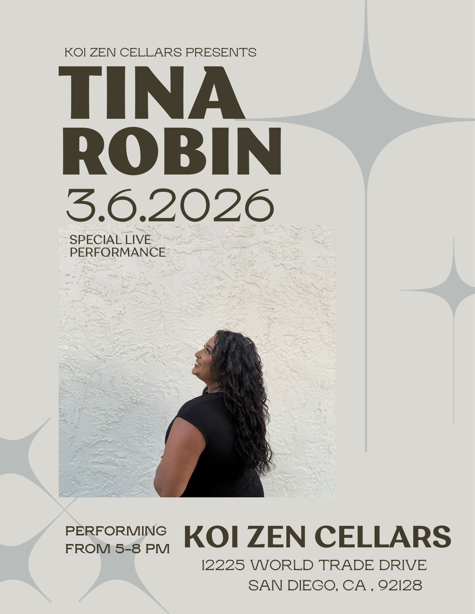 Tina Robin is a 25 year old vocal performer and pianist. She has been involved in community and professional musical theater and her passion for music has only grown throughout her career.A graduate of the Conservatory of Music Theatre at New York Film Academy, Tina enjoys performing for large groups, on stage, or in small intimate gatherings. You’ll hear her playing anything from R&B, like Alicia Keys, to contemporary pop, like Adele. A native of San Diego, lets all welcome Tina to Koi Zen Cellars!